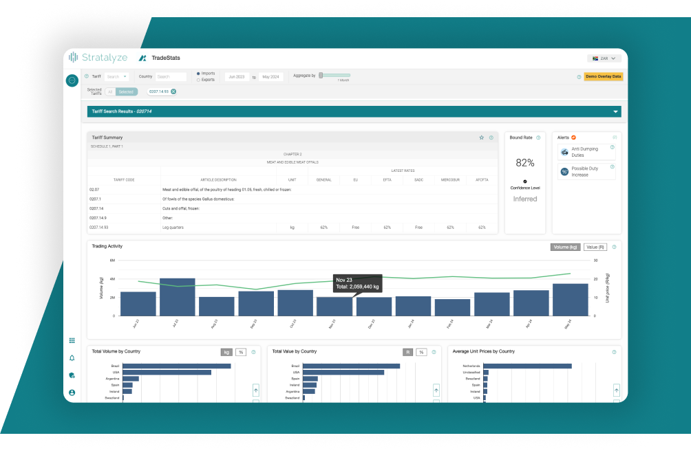 Each month we import millions of import and export entries from SARS, at the most granular level possible. You get to view this data in easy-to-use dashboards, showing you the trade, but also the tariff book, with duty and bound rates (maximum levels a given duty can be raised to). There are alerts telling you if worrying trends are developing or if there are anti-dumping duties on the product. You will also be told of opportunities of interest.